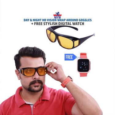 The Day & Night HD Vision Wrap Around Goggles are designed for clear vision in both bright and low-light conditions. Featuring anti-glare yellow lenses, scratch resistance, and dust protection, they offer excellent durability. Plus, they come with a stylish digital watch for added functionality and fashion. Perfect for everyday use, these goggles ensure comfort and clarity.