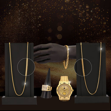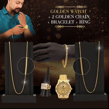 Enhance your style with this exquisite men's accessory set featuring a golden wristwatch with analog display, water-resistant design, and stainless steel bracelet strap. Accompanying the watch are two distinct golden chains, a stylish bracelet, and an adjustable ring adorned with Austrian diamonds. Elevate your look for casual, party-wedding, and formal occasions with this meticulously crafted ensemble. Each piece exudes a golden finish, adding a touch of sophistication to your overall appearance