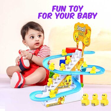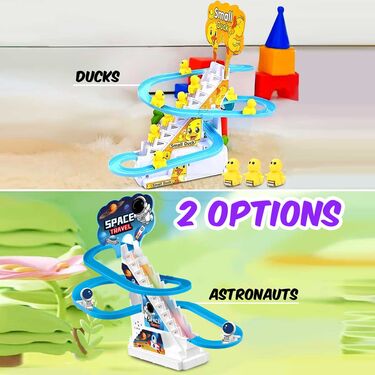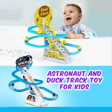 The Astronaut/Duck/PenguinTrack Toys for Kids is a delightful and engaging playset designed for children aged 2-5 years. It features three playful astronauts that climb stairs and joyfully slide down the slope, with a music on/off switch for quiet play. The set is made of high-quality ABS plastic, ensuring it is 100% non-toxic, safe, and durable. This toy promotes visual perception exercises, aiding in color recognition and developing hand-eye coordination, making it great for autistic children. Easy to assemble, the set includes a battery-operated game board and three racing penguins. It requires 3 AA batteries (not included). This toy is perfect for providing endless fun and helping strengthen the parent-child relationship
