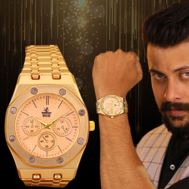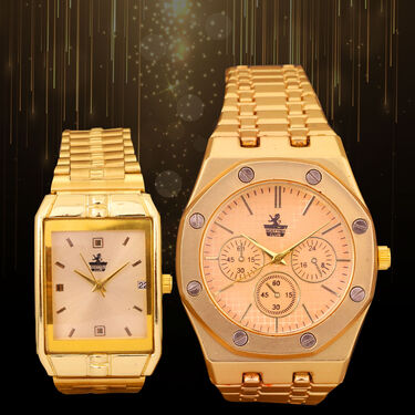 Elevate your style with this stunning pair of men's golden watches. Crafted with stainless steel straps and designer metal straps, these watches exude sophistication. The analog display and quartz mechanism ensure accurate timekeeping for any occasion, whether casual, formal, or a party. With water resistance they offer durability and reliability. Featuring golden plating and an octagon shape, these watches add a touch of luxury to your ensemble. Powered by a reliable button cell battery, they are both stylish and functional. Complete with slide clasps for easy wearing and cardboard boxes for storage, these watches are a timeless accessory for every man's collection