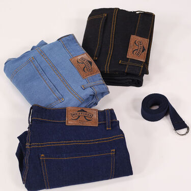 Elevate your wardrobe with Mr.Tusker's set of 3 denims, each offering a relaxed fit for ultimate comfort. These denims provide ample space in the seat and thigh, catering to various body structures. Crafted with wrinkle-resistant and durable fabric, they are perfect for regular wear throughout the year. The set includes three versatile colors â?? Light Blue, Dark Blue, and Black, complemented by a stylish blue canvas belt, making it a must-have for all ages. Easy to maintain, these denims are suitable for daily wear, ensuring complete comfort and style