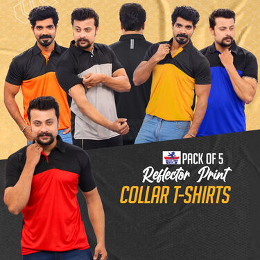 Elevate your wardrobe with this pack of five stylish reflector print collar t-shirts, perfect for every occasion. Crafted from premium fabric, these t-shirts ensure maximum comfort and flexibility, making them ideal for all-day wear. The breathable, quick-dry material keeps you feeling fresh, whether youâ??re out for a morning walk or heading to a casual gathering. With reflective stripes on the back, they provide added visibility for outdoor activities, enhancing your safety during low-light conditions. Available in five vibrant colorsâ??red, sky blue, yellow, black, and orangeâ??these t-shirts are versatile enough to pair with any bottom. The wrinkle-resistant feature means minimal maintenance is required, allowing for hassle-free care. Designed to fit all body types, they are a must-have for anyone seeking both style and comfort. Make these t-shirts your go-to choice for both regular and active wear